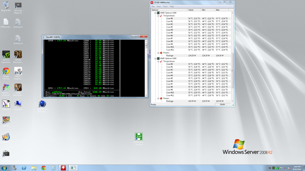 You should try running BarsWF x64 CUDA, I ran this with my Dual 6-Core AMD OpteronDP 2435 and it's GTX 295 Red Editions and the later GTX 680's, this little apps is very multi threaded friendly, I use it to compare CUDA Performance over different GeForce GPGPU's but also to compare my Opterons from my previous builds with my later ones