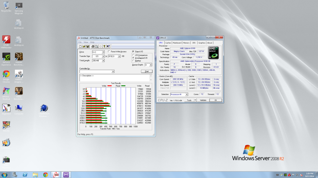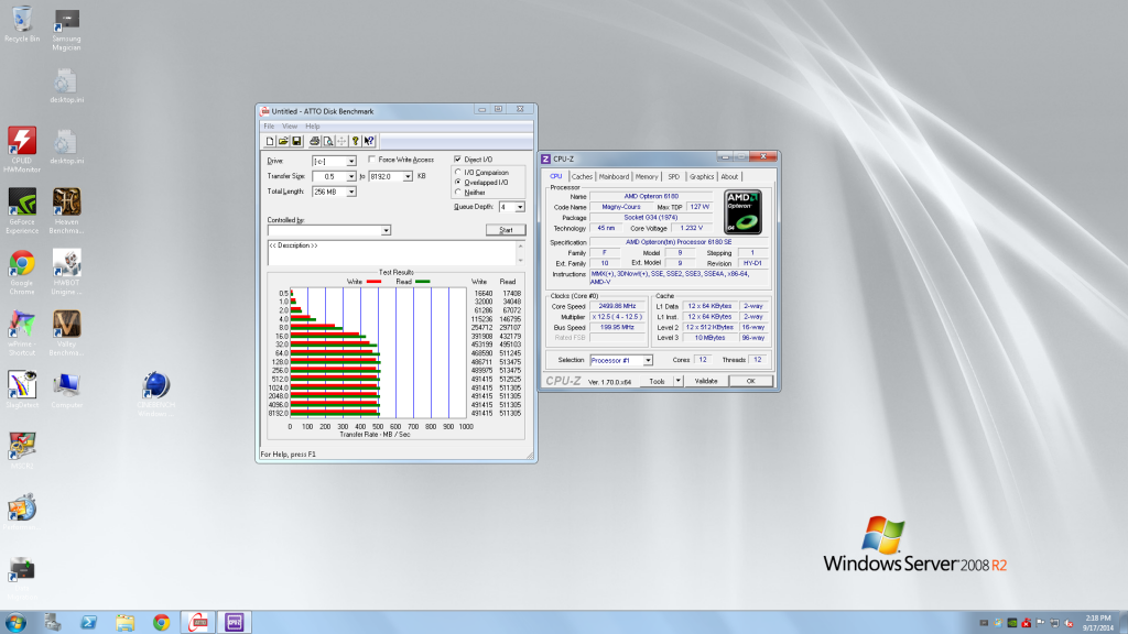 Goes for the following three: Firefox SMP 2006: Dual 2-Core OpteronDP 285 E6 4x 2.6Ghz 4x 2048MB PC-3200 ECC Reg HP/Micron Tech Server Ram ASUS K8N-DL NVIDIA GeForce GTX 480 PCI-E 1280MB GDDR5 320Bit Rev.A2 5009 Engineering Sample Auzentech X-Fi Prelude 7.1 PCI 64MB XRAM Blue-Leader SMP 2009: Dual 6-Core OpteronDP 2435 D0, 12x 2.6Ghz 4x 4096MB PC2-6400 ECC Reg Kingston Value Ram Supermicro H8DAE-2 EVGA GeForce GTX 480 PCI-E 1536MB 384Bit GDDR5 Rev.A3 2110 Realtec ALC 883 7.1HD Audio Valkyrie SMP 2014: Dual 8-Core OpteronMP 6140 C0, 16x 2.6Ghz 4x 4096MB PC3-12800 ECC Reg HP/Micron Supermicro H8DG6-F Sapphire Radeon R9 290X PCI-E 4096 512Bit GDDR5 Rev.A13 3713 Auzentech X-Fi Forte 7.1 PCI-E 64MB XRAM Although I do think that Multi-Core Apps would run better with Windows Server 2008 R2 over Windows 7 Professional + SP2, just guessing here but I do greatly agree with Win7 Pro should have 4CPU support over 2CPU support anyday, oh yes I greatly agree there ![]() As the SSD performance goes I am not so sure, so far everything loaded way faster than any HDD could do, I can test this for you when I get back home, I will let you know when I am back, at the moment I am on my 3 Month South European Camping trip with my parents I am on a Campsite in Blanes, Costa Brava Spain atm ![]() But I can run some tests for you to find out how the H8DAE-2 and the H8DG6-F do with their SSD's here, both do use a SATAII-300 connection btw.