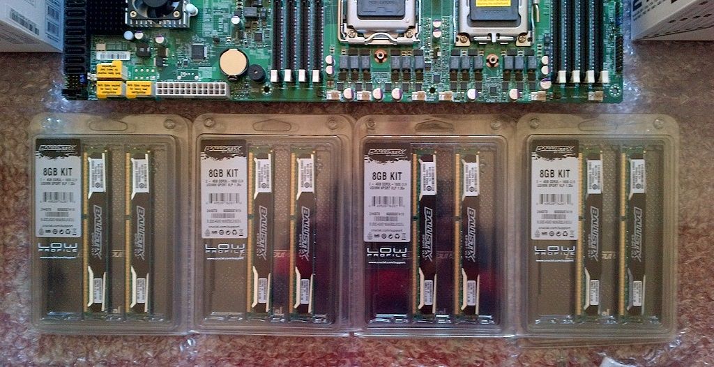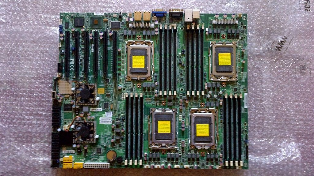 "Quad Opty" SuperMicro H8QGi-F 4x AMD Opteron 61xx "Extra Spicy" chips 32GB (16 x 2GB G.Skill DDR3-1600) Noctua NH-U9DO A3 cpu coolers hushed up SuperMicro SC748S R1000B case Addonics AD4SAHMSA mSata SATA3 controller w/Samsung 840 EVOs EVGA GeForce GTX 760 "Dual Opty" Tyan S2927E 2x AMD Opteron 8439SE Dynatron F558 coolers SilverStone DA650 modular PSU (650w) 16gb Kingston DDR2 667 server ram |